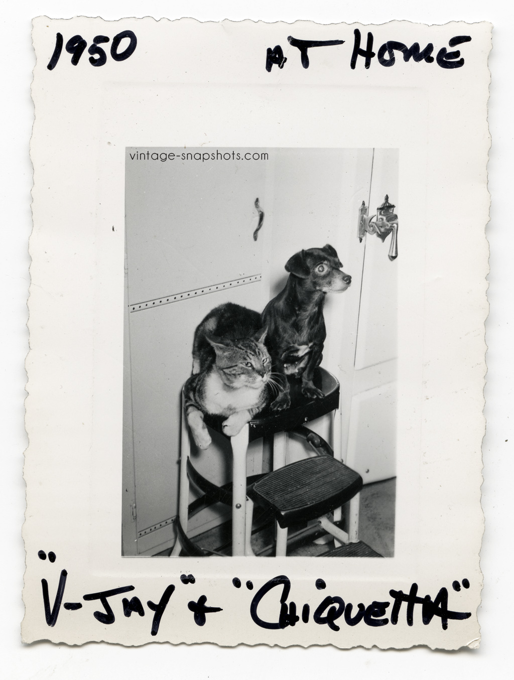 The name of the cat in this 1950 snapshot makes me wonder if he was perhaps born on or around V-J Day. ‘Victory Over Japan Day’, which marked the end of WWII, is celebrated in the United States on September 2, after the day in 1945 the surrender document was signed by Japan (although it also applies to August 14 or 15 — depending on whether one takes into account the time zone — which was the day the surrender was announced). The cat looks to be about the right age to me. If he was indeed named after the end of WWII — wow, what a great way to choose a cat name, and in some small way, perhaps a marker of how happy/significant a day that must have been for so many who experienced it.