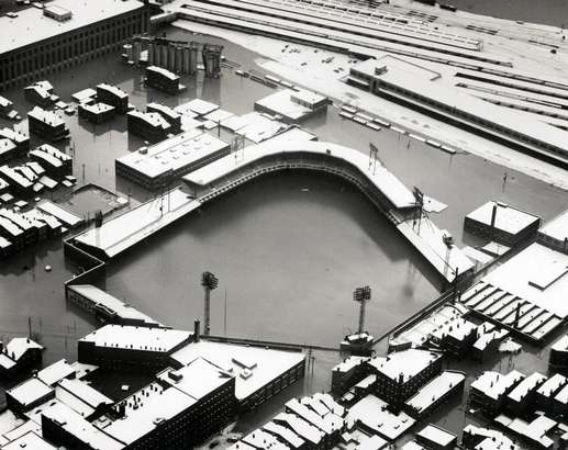 98-year-old Dan Henry lives in California and is another who remembers the flood – and may have had a better view of it than just about anybody. He was a pilot who took to the air to capture images for the Cincinnati Enquirer, and was shocked at the devastation he saw. He took the photo below of Crosley Field, the baseball stadium of the Reds at the time. The field had had sand placed on it before the waters came, and was rather amazingly ready for the start of the season a little over two months later.