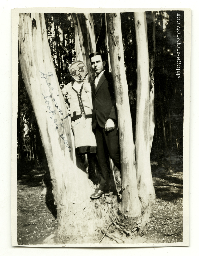 The face is on a piece of paper that has been glued to the back and shows through a hole cut in the photo.