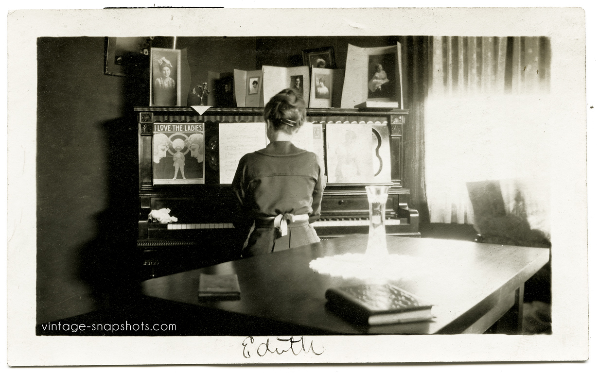 Vintage snapshots of people sitting at pianos are not uncommon, though this is one of the nicer ones I think I have come across — for several reasons in my view, including its composition/light, the framed photographs on the piano, the fact that the woman is actually playing rather than merely sitting or posing, and for the sheet music to her left. (See the full photo below.)